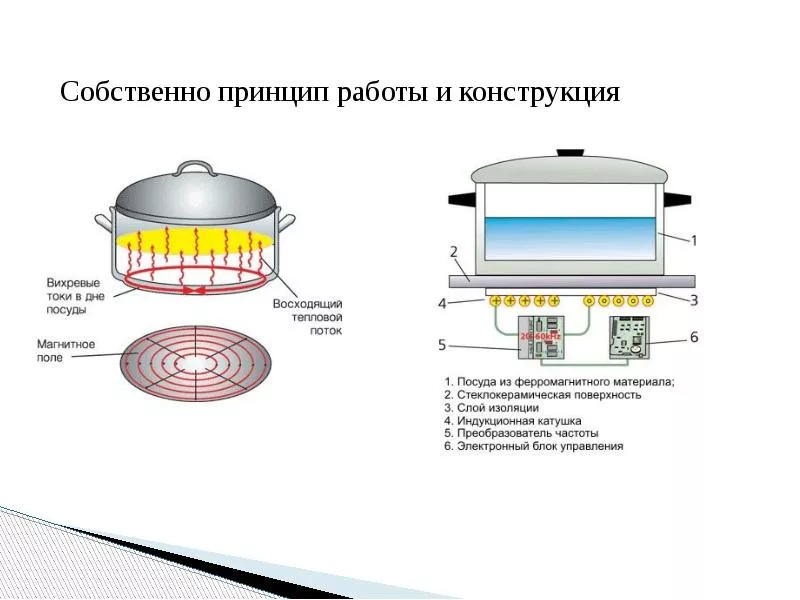 В отличие от традиционных плит, где нагрев происходит за счет теплопроводности или сжигания газа, в индукционных плитах тепло генерируется непосредственно в дне посуды. Под стеклокерамической поверхностью плиты расположена индукционная катушка, создающая переменное магнитное поле высокой частоты. Когда на плиту ставится посуда с ферромагнитными свойствами (например, чугунная или из нержавеющей стали), магнитное поле создает в дне посуды вихревые токи, которые, в свою очередь, вызывают нагрев металла.