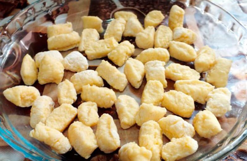 - Формирование клёцок. Скатайте тесто в тонкие колбаски и нарежьте на небольшие кусочки. Можно также отщипывать тесто ложкой непосредственно в кипящий суп.