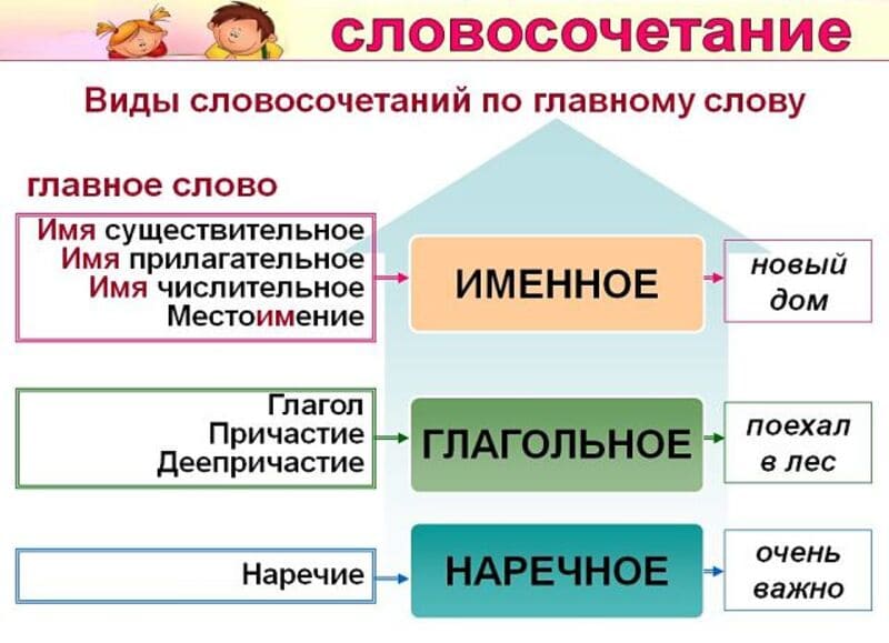 - Глагольные словосочетания. Главное слово — глагол. Например: «читать книгу», «идти быстро».